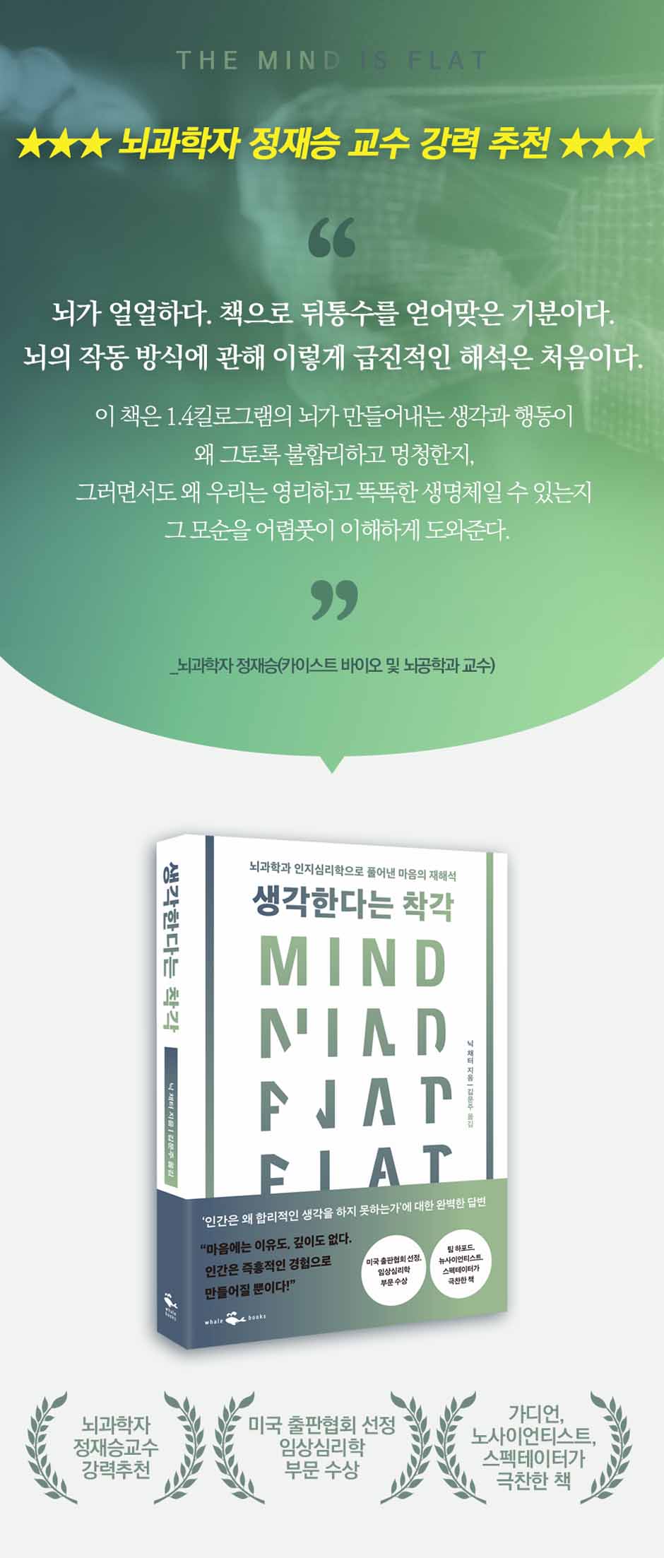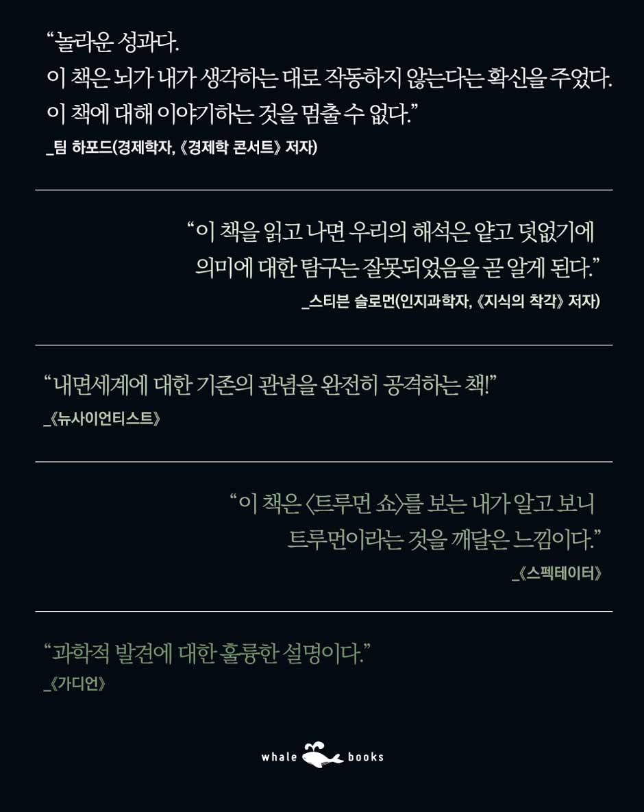 저자 닉 채터는 베일에 가려진 심오한 마음이라는 것이 사실상 없다고 주장한다. 최고의 행동과학자인 저자는 그동안 해온 연구의 방향과 완전 다른 새로운 개념을 뇌과학, 신경과학, 인지심리학, 행동심리학 등을 통해 밝혀낸다. 내면의 믿음이나 가치, 욕망이라는 것은 딱 정해진 무언가가 아니라 과거 경험에 의해 만들어진다. 즉, 오늘의 기억은 어제의 해석일 뿐이라는 것이다. 그래서 인간은 내면 기저에 있는 어떤 것에 영향을 받아서 행동한다기보다 스스로 계속해서 정체성을 만들고 끊임없이 즉흥적으로 행동한다. 결국 이렇게 만들어진 경험이 우리 자신의 행동 방향성과 내면의 심리까지도 영향을 끼친다.