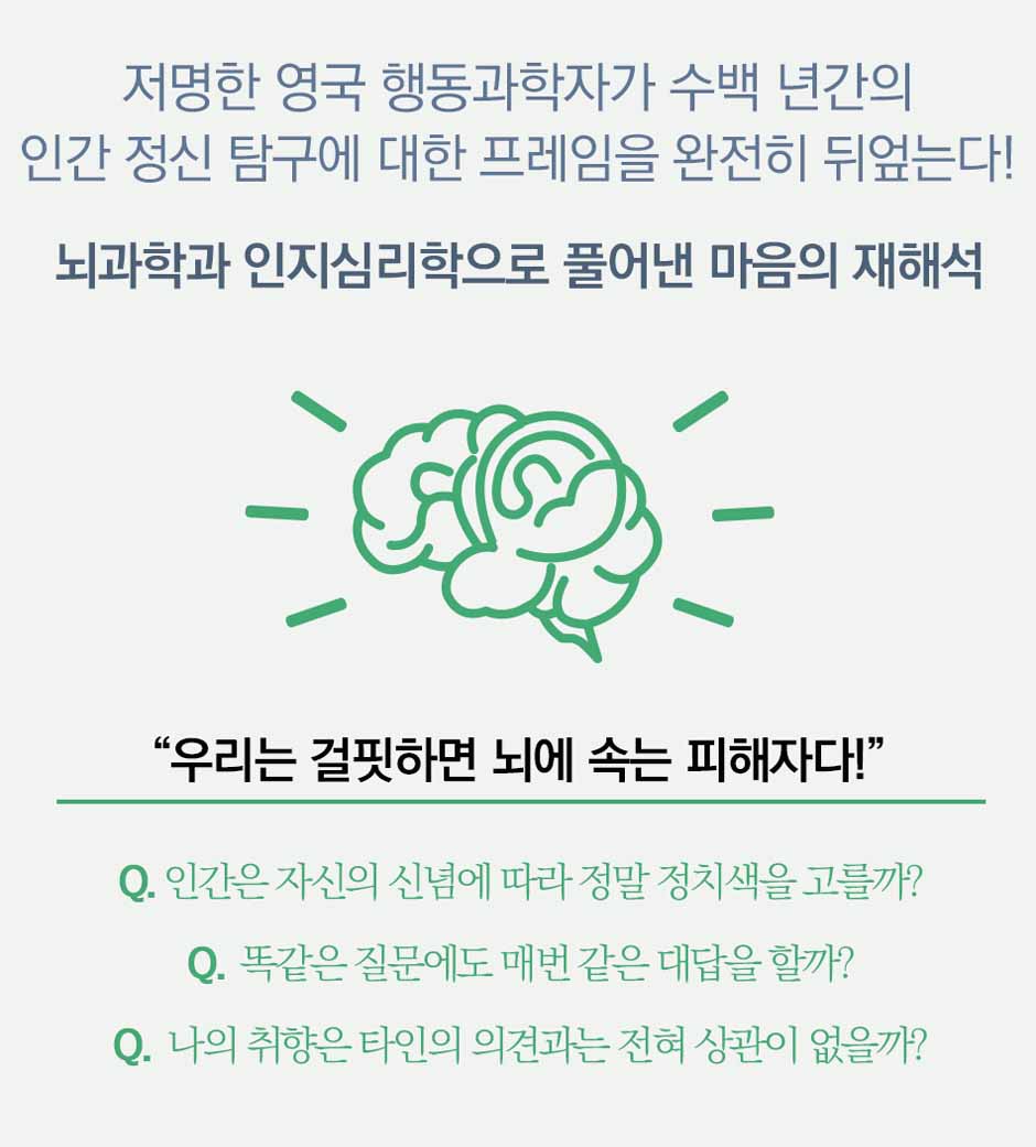 인간은 자신의 신념에 따라 정말 정치색을 고를까? 똑같은 질문에도 매번 같은 대답을 할까? 우리는 생각과 욕망, 행동이 알 수 없는 깊은 내면세계에서 비롯된다고 굳게 믿으며, 숨겨진 내면이 있다고 생각하기를 좋아한다. 그렇기에 내면을 다 알지 못하고는 자신을 온전히 이해할 수 없다고 생각한다.