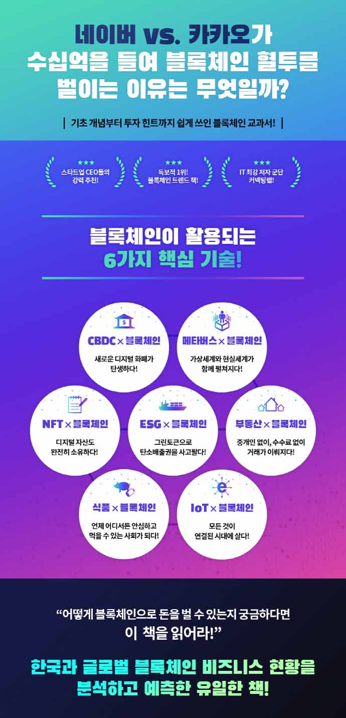 한국의 대표적 빅테크 기업 카카오와 네이버의 블록체인 경쟁이 점점 치열해지고 있다. 수십억 원을 글로벌 블록체인에 기업에 투자하는 것은 물론 그라운드X, 라인플러스 등 블록체인 자회사의 규모도 키우는 중이다. 카카오 그라운드X가 승기를 잡은 한국은행 디지털 원화 사업(CBDC)도 그동안 카카오의 블록체인 투자가 결실을 맺은 순간이었다. 이렇듯 블록체인은 단순히 가상화폐 기반 기술이 아니라 미래 산업을 이끄는 기업들은 반드시 갖춰야 하는 필수 기술이 된 것이다.