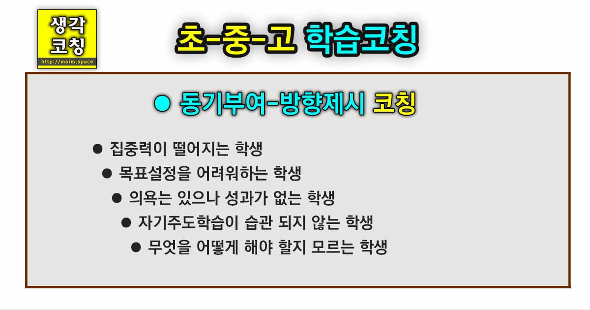 학생이 자신의 현실을 인지하고 어떠한 방향으로 갈 것인가 정하는 과정에서 내적 학습동기를 유발하여 근본적인 변화를 이끌어내는 코칭입니다.